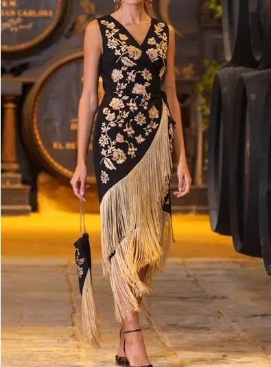 This striking black dress features beautiful beige floral embroidery that adds a touch of elegance and sophistication. The dress is designed with a flattering wrap silhouette, which enhances its chic and timeless appeal. It’s finished with a delicate fringe detail that flows elegantly with every step, perfect for evening events or cocktail parties where you want to stand out.